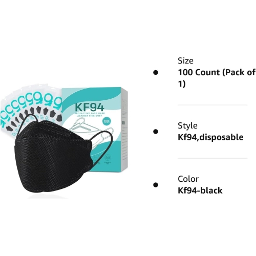 - 100 PCS Adult Black KF94 Face Masks with Nose Clip