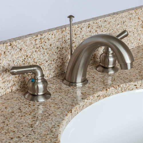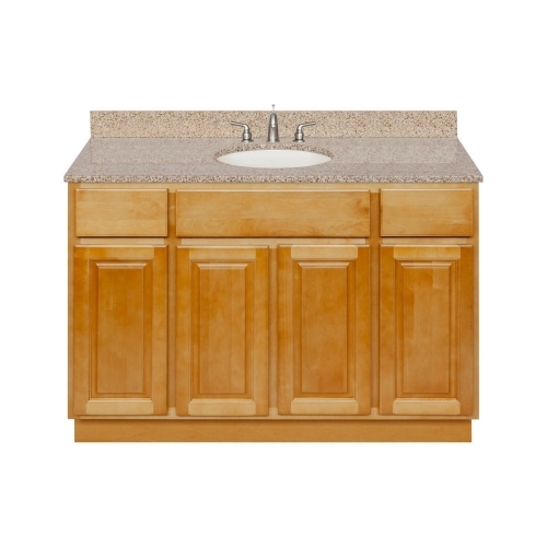 All-in-one vanity set including 49 inches wide Wheat Granite single sink vanity top (white ceramic sink comes pre-installed) combined with 48 inches wide vanity cabinet and beautiful faucet LB4B by LessCare.