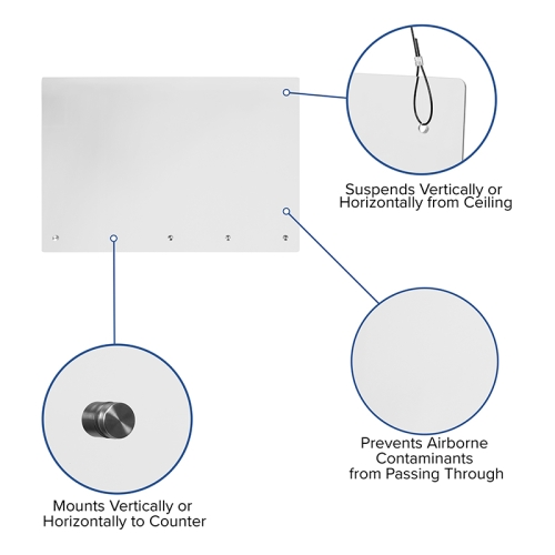 This hanging clear shield acts as a physical barrier and helps to maintain safe spacing between employees and customers. This multi-directional sneeze guard shield may be suspended or mounted either vertically or horizontally and be height customized up to a 50" drop from the structure. This partition can fit almost any purpose and allows you to decide which areas to protect and gives a larger area of protection. This acrylic shield can be suspended from the ceiling or mounted to the counter, hardware is included for both options.