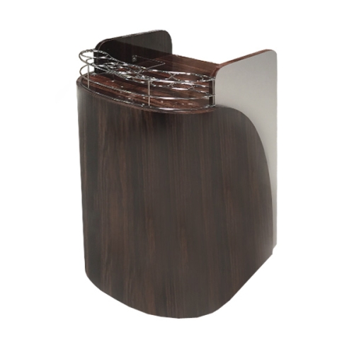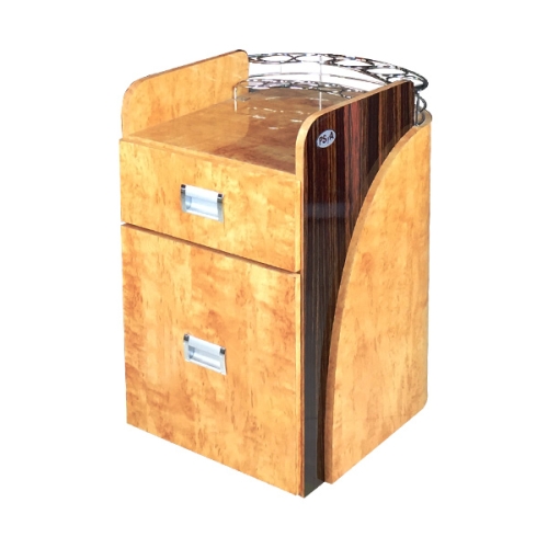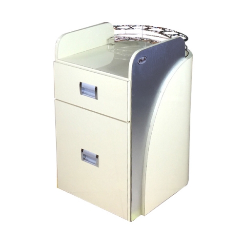 Alumminum accent for easy cleaning and slick looks with 2-tone color, it is built with commercial grade formica. This is hard to find item. It comes with stainless steel rack for nail polish and other chemical bottles.