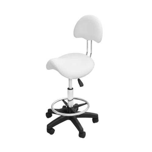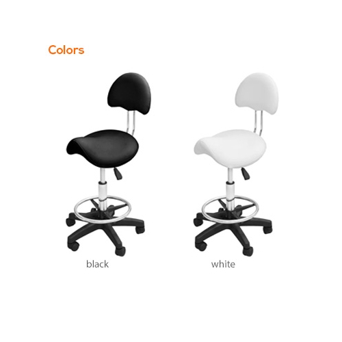 The Kelley Esthetician Stool is a elegant and modern saddle stool. It comes complete with a polished chrome foot ring base for durability and padded back and seat cushion for comfort. It also sits on 5 casters for easy mobility and comes available in black or white.
