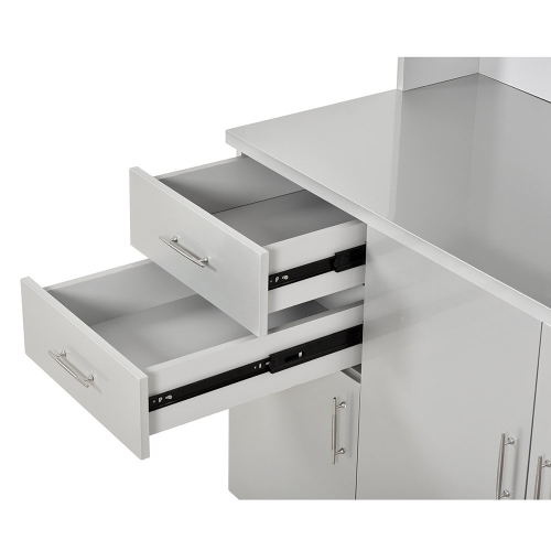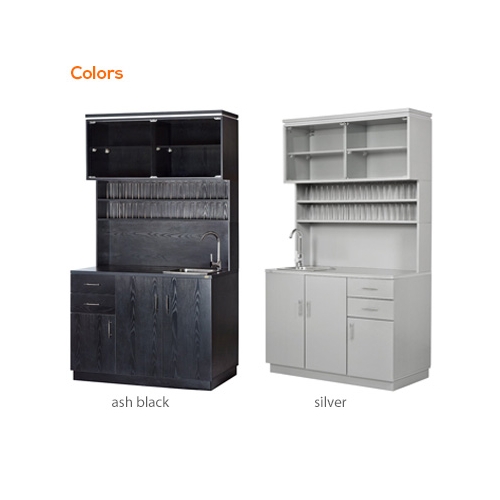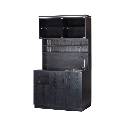 Color Bar Maple with wash sink. Maintaining a clean space for mixing & combining chemicals has never been easier. This unit features spacious cabinets, drawers, and stacking hair color storage slots. The counter top is made from water-proof wooden material for easy-to-clean work-space along with long lasting use, with a bonus pull out cabinet to house trash can for unwanted trash. This units includes a chemical storage rack below and spacious glass sliding door cabinets to house towels and display shelves for products. The stainless steel sink also comes with a single handle faucet and drain assembly, all water supply lines included.