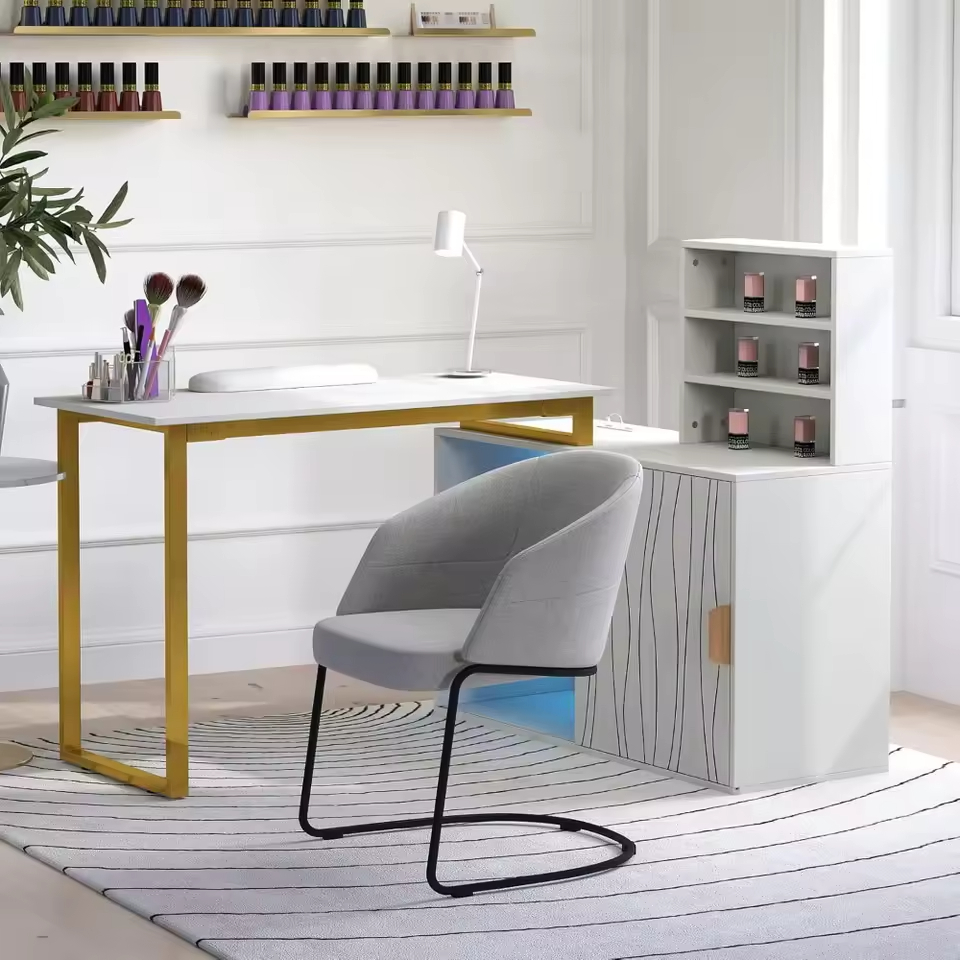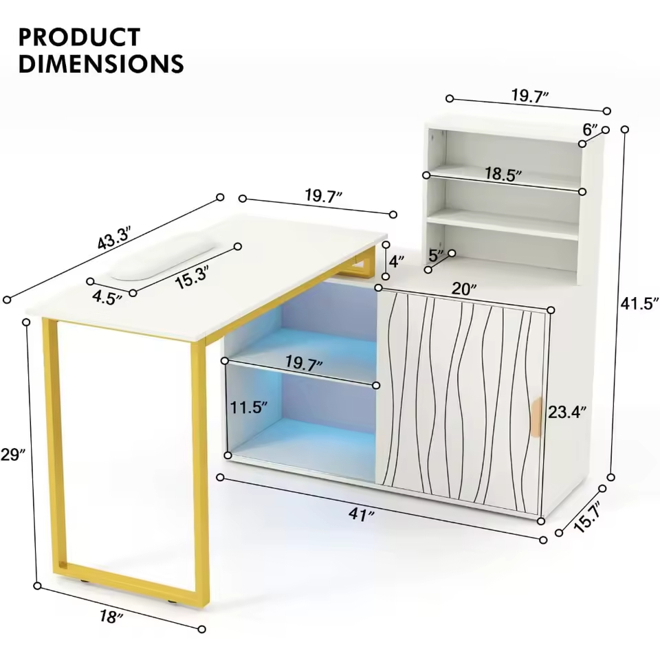- PERSONALIZED DESIGN - The whole storage shelf above it can be installed on one side of the desktop. With 1.5M long power cord, two 3-prong AC outlet and 2 USB ports, this manicure table offers you enough charging space for your electronic devices
