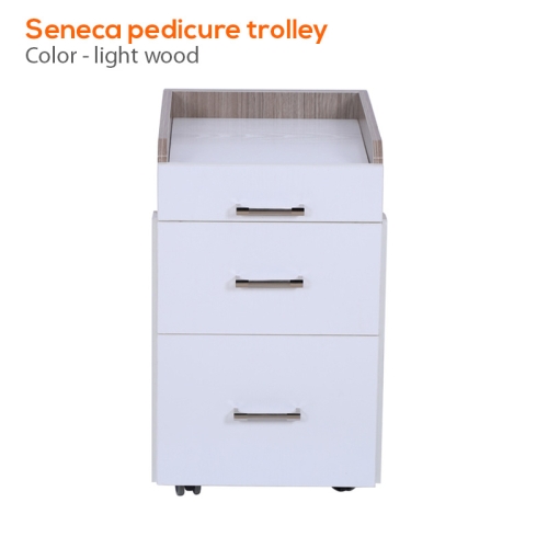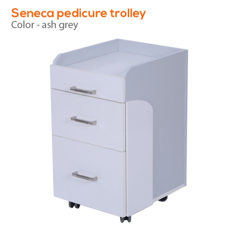 The Seneca pedi cart is an upscale piece with chrome handles, hardwood veneer, and two accent colors: ash grey and ash wood. This pedi trolley can be easily moved about the nail salon with four highly functional casters. The simple yet beautiful design is the staple design style of the Seneca salon furniture line.