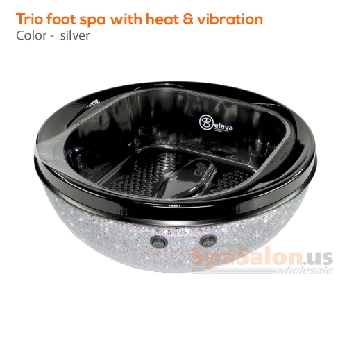 - With Silver color: The two-toned Glitter Silver Bottom/Black Top Trio Foot Spa has an elegant, industrial look. The bottom of the bowl is in "moon silver" color, while the interior of the bowl and the pedicure tub are black. The Glitter Silver Trio Foot Spa is shipped to you with complimentary 20 disposable liners for hygienic pedicure soak.
