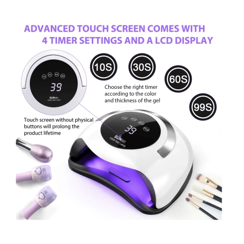 - 【 4 Preset Modes 】 4 timer setting(10/30/60/99S) Simply push the button for various purposes. Large Digital LCD displays the timers.The Nail Dryer has build-in over-heat protection which is designed for less tanned skin while curing the gels. The curing lamp also has a build-in auto sensor which detects your hand in or not. The lamp auto turns on/off for curing which provides a touch free curing. It brought you a significant convienience when using our device.