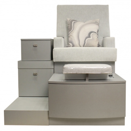 The Lounge Pedicure Spa Chair series clean, tailored aesthetic makes it a smart choice for many salon and spa settings. The Lounge Pedicure spa chair spins off the Charles Pfister chair. Charles Pfister was our kind of modernist. “There is a movement away from throw-away society, away from disposable possessions,” said Pfister. “Instead, there is a mounting interest in useful, sculptural, wonderfully constructed objects.” His lounge collection from 1971 is both sculptural and wonderfully constructed, embodying his intent to design items that display “opulence without waste.” Made in USA. The Lounge single seat pedicure chair is made with individual seats as shown here. One of the plushiest seats for a pedicure spa chair. Shown with two upper storage drawers and a cutout for an electric box is optional extra cost at each step section. An adjustable footrest is shown on the face of the access panel. The front face of the pedicure has an access panel to connect the finish plumbing connections. The Lounge single seat pedicure chair is individual seating as a bench, and is customize-able, it be made with more seats and for more people if you have the space in your salon. Another choice is it can be customized and adjusted even further by changing dimensions so it will maximize your space in the nail salon. Shown here with a color coordinated solid surface counter top hiding the stainless steel basin in an under-mount configuration. Stainless steel pedicure sinks are the strongest and lasting basins. The Lounge single seat pedicure chair can be made using any of the sink options shown here. A solid surface sink shown in the options on this page can be used in replacement of the stainless pedicure basin.