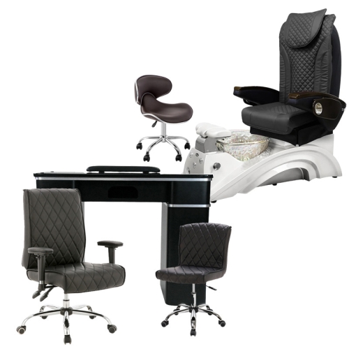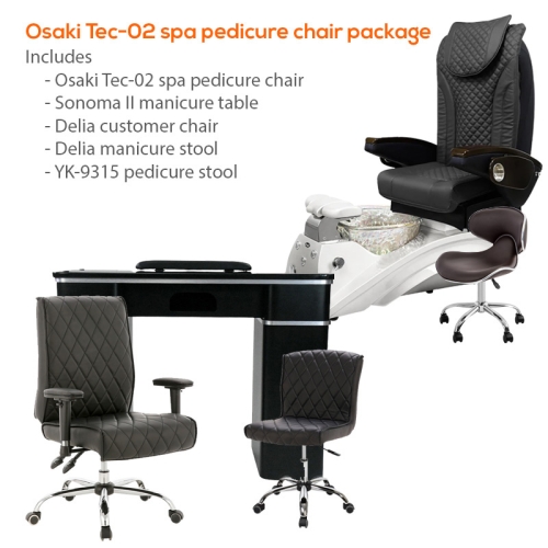 Includes: Osaki Tec-02 spa pedicure chair, Sonoma II manicure table, Delia customer chair, Delia manicure stool, YK-9315 pedicure stool