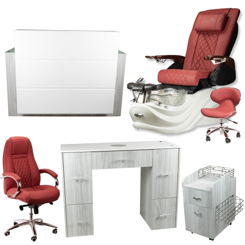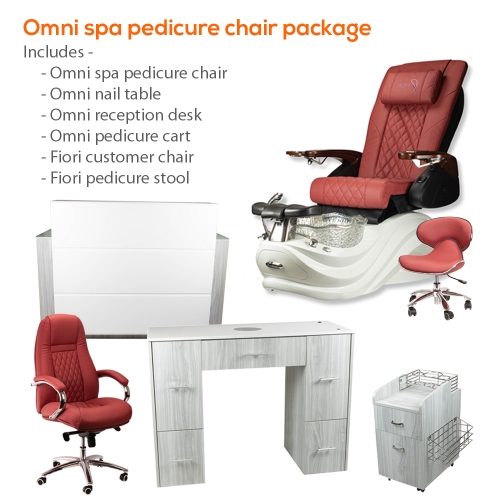 Includes: Omni spa pedicure chair, Omni reception desk, Omni nail table, Omni pedicure cart, Fiori customer chair