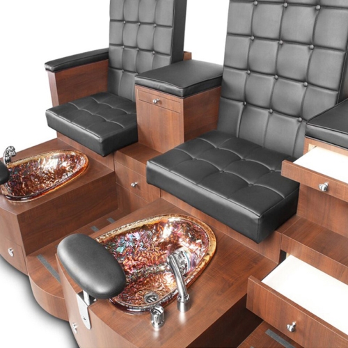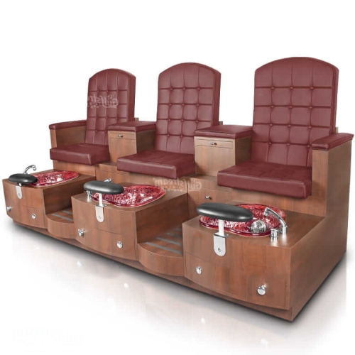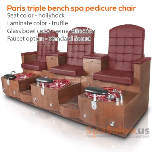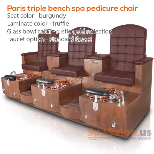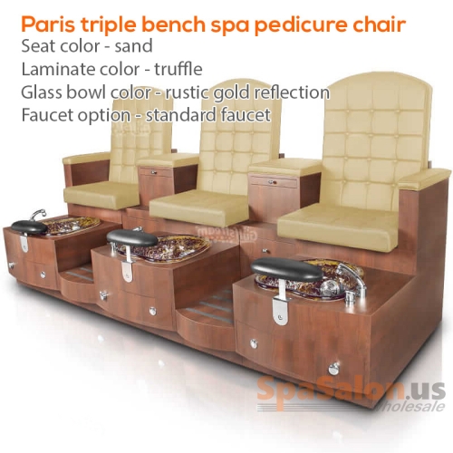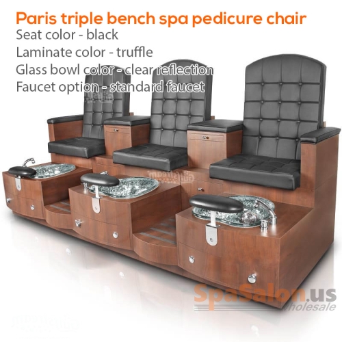 Paris triple bench spa pedicure chair features and elegant glass bowl, cleanjet system, pullout faucet and adjustable foot rest. Also, it is very convenient with a large storage drawer and a pullout drink tray. Select your choice of upholstery and pedicure glass bowl.