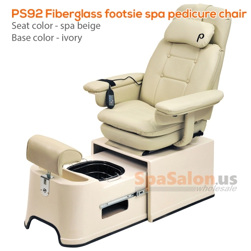 Pibbs PS92 Fiberglass Footsie Pedicure Spa is Made in the U.S.A. with a high durability fiberglass shell and it does not require plumbing to operate. This Pedicure unit features the Footsie Footbath which is ultra-lightweight, extra deep, has double heating elements and superior vibration. The Footsie Footbath features disposable, ultra-hygienic liners that require no cleaning and no chemicals. The chair top of this pedicure chair swivels for easy client access and it features an adjustable reclining back with 6 vibration functions. The fiberglass base is retractable and allows you to save space when it is not being used. There is also an adjustable footrest that makes it easy on both the technician and the client. This Pedicure Chair is available in multiple color combinations with 6 vibrant colors to chose from.
