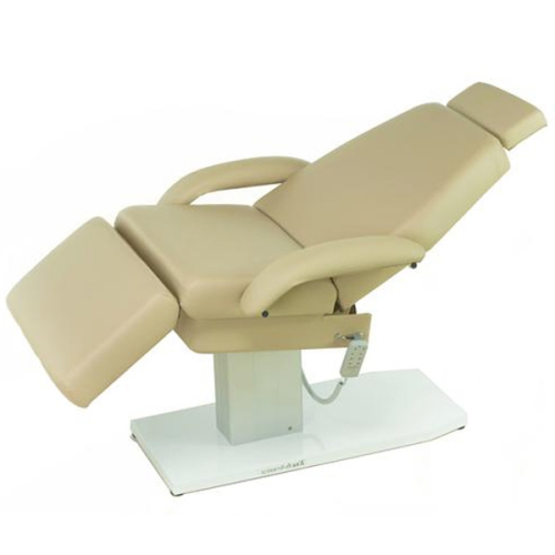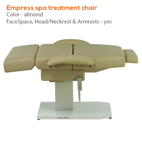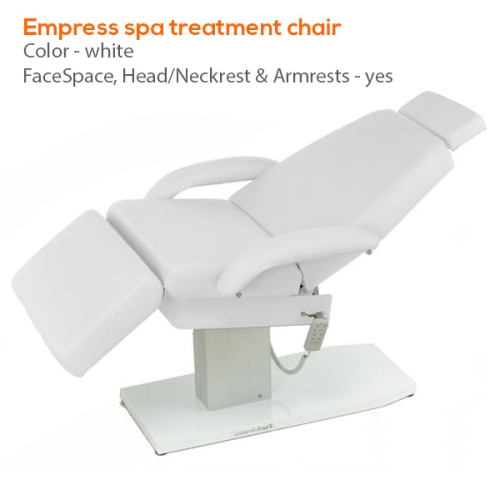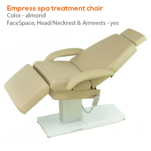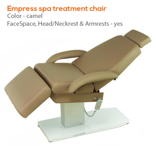 The petite Empress chair/table is ideal for medical spas and for facials/pedicures where space is limited. The innovative tilt mechanism allows for incline therapy. Not suitable for massage. Add accessories to extend the table length. Shown with optional accessories.