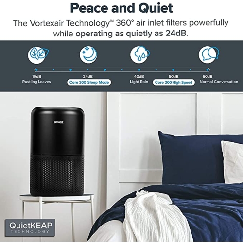 - WHISPER QUIET AIR CLEANER: Choose Sleep Mode at night and then forget all about your air purifier while you sleep. QuietKEAP Technology reduces noise levels to a near-silent 24dB, ensuring the Core 300 won’t get in the way of a good night’s rest