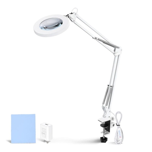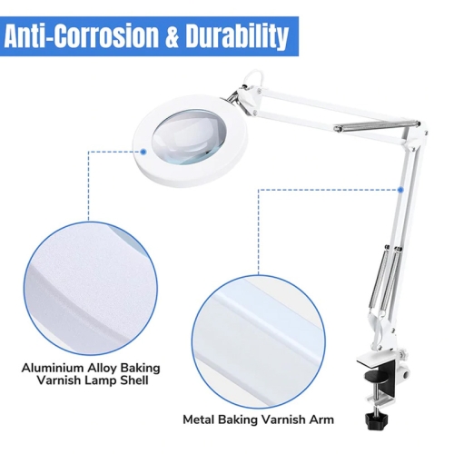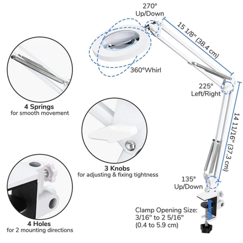 Yescom Clamp-On Illuminated Lighted 5x Magnifier Lamp is ideal for Reading, Salon Hobbyists, Beauticians, Circuit Board Inspection or just as a Vision Aid. It is convenient to use as its lens head can rotate left and right with 360° and flip up and down 270°. With the desk clip, you can easy assemble it in any position.