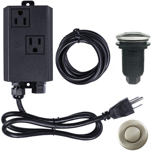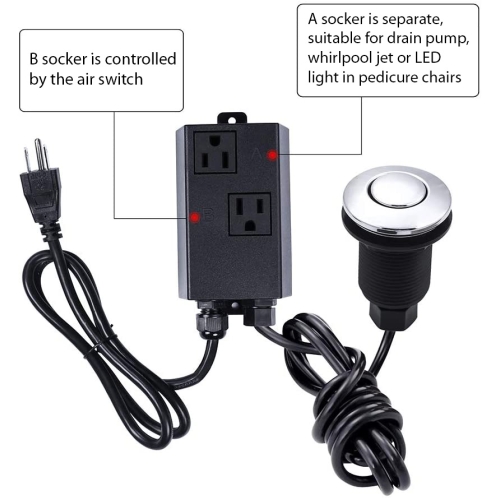 Air switch kit includes: Single outlet power module, 5 ft long air tube, 2.5 ft power cable, 2" or 2.7" stainless steel brushed nickel air switch button, set screws and strong nano-markless hook sticker